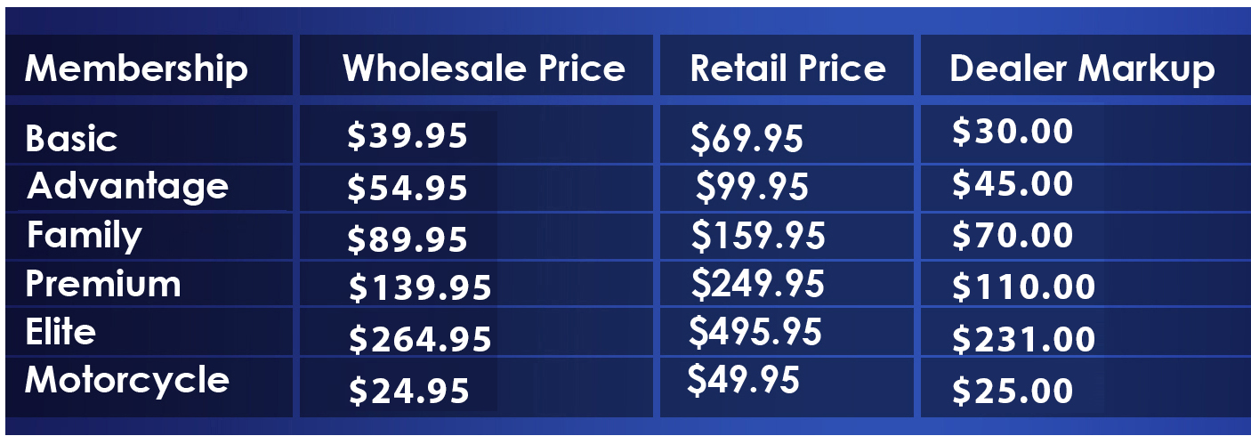 As an approved Dealer, the Dealer will be permitted to purchase the Company's Memberships at Wholesale Prices and Re-sell them at Retail Prices determined by the Company. These Wholesale and Retail Prices will be determined according to the table shown below. Wholesale and Retail prices will only be changed according to written notice to be provided by the Company. Dealer hereby agrees not to change the Retail Prices of the Memberships without written authorization from the Company. The difference between the Wholesale and Retail Prices quoted below will be the Dealer's profit and will be referred to as Dealer's Markup. These prices will be valid until further notice.